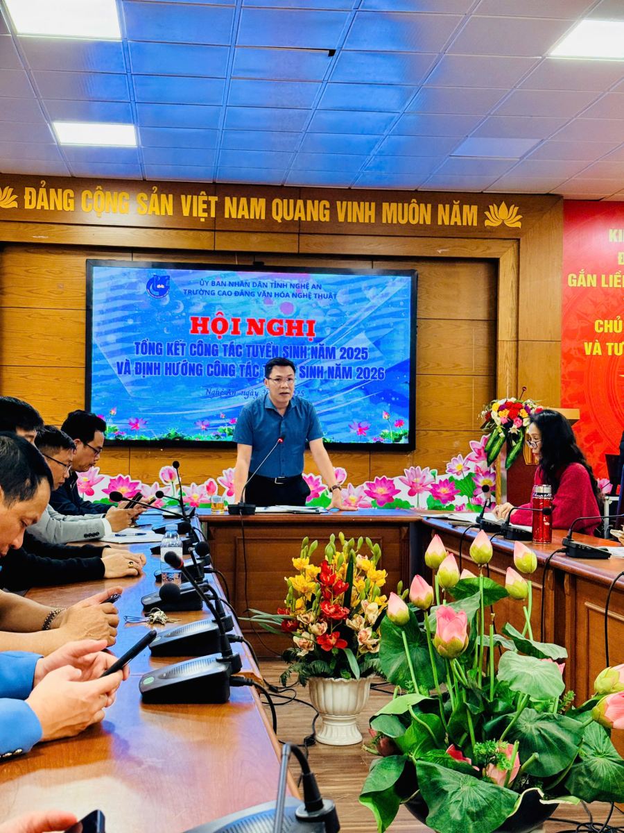 Chiều ngày 30/12/2025, Trường Cao đẳng Văn hóa Nghệ thuật Nghệ An đã tổ chức Hội nghị tổng kết công tác tuyển sinh năm 2025 và triển khai định hướng, kế hoạch tuyển sinh cho năm 2026. Đây là sự kiện quan trọng nhằm đánh giá những kết quả đã đạt được, đồng thời đề ra những giải pháp chiến lược để nâng cao hiệu quả công tác tuyển sinh trong giai đoạn mới.